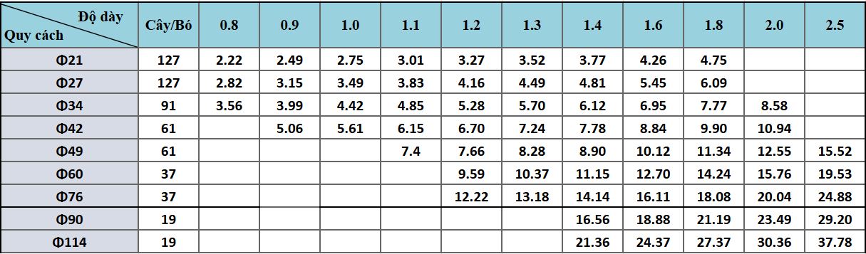 Bảng tra trọng lượng sắt ống Cường Phát SG