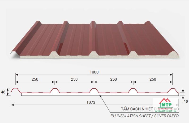 - Cấu tạo 3 lớp: tôn 5 sóng vuông + lớp PU/PE foam + tôn/giấy bạc