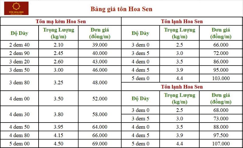 Cập nhật bảng giá tôn Hoa Sen chi tiết, đầy đủ các sản phẩm