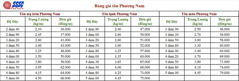Bảng giá tôn Phương Nam mới nhất 01/2026