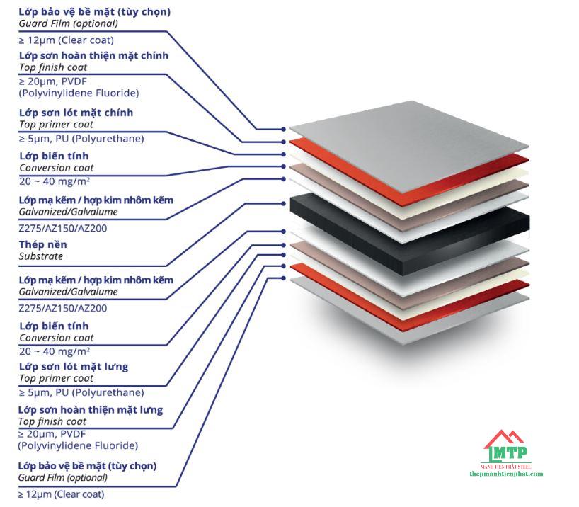 - Đặc điểm: Sơn phủ PVDF cao cấp với 70% nhựa Kynar 500® hoặc Hylar 5000® kết hợp thép nền mạ kẽm hoặc nhôm kẽm. Độ bền màu và chống ăn mòn ở mức cao nhất, đặc biệt hiệu quả trong môi trường có tác nhân hóa học, sinh học.