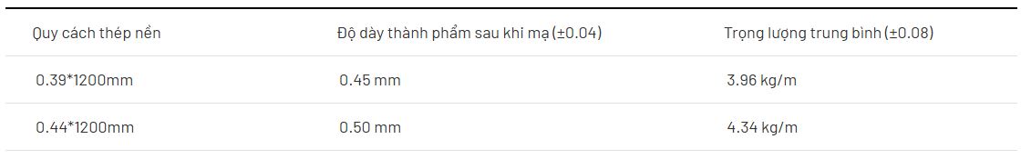 | Độ dày thép nền (mm) | 0.32 ~ 0.65 | 0.35 ~ 0.65 | 0.40 ~ 0.92 |
