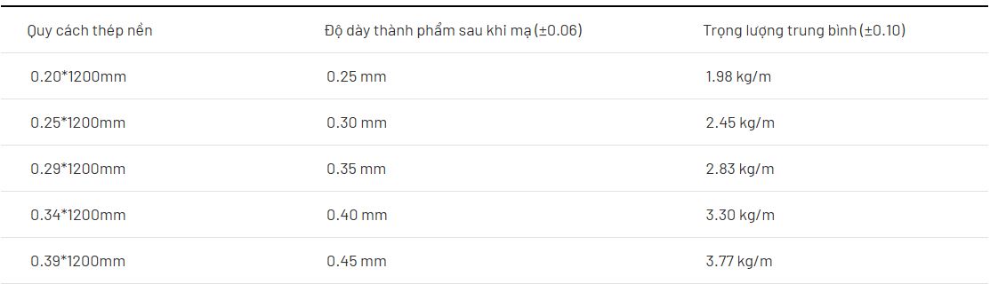 | Độ dày thành phẩm (mm) | 0.41 ~ 0.74 | 0.44 ~ 0.74 | 0.48 ~ 1.00 |